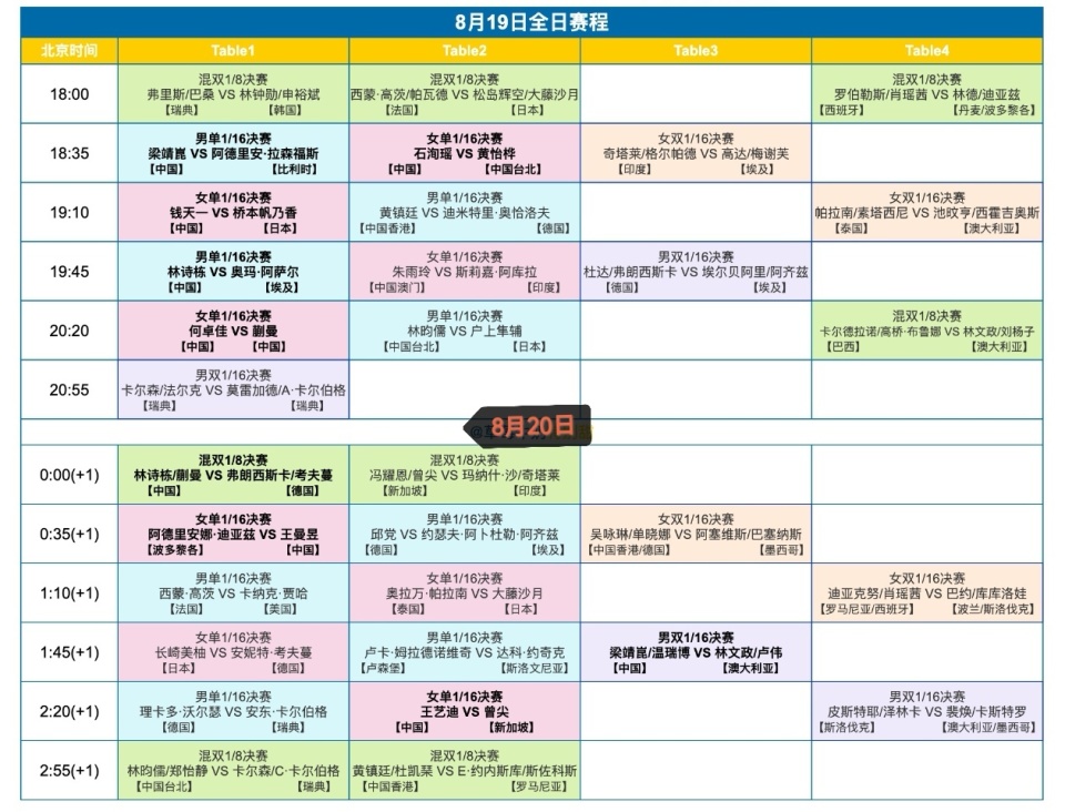至此国乒15人参赛,除了第一日林高远2-3法国名将西蒙·高茨,向鹏1-3德国世界冠军奥恰洛夫失利外,其他13人全部顺利晋级32强。今天比赛进入男女单打第二轮1/16决赛以及双打1/16决赛和混双1/8决赛的较量。完整赛程如下图,其中国乒具体赛程为: